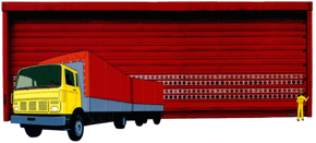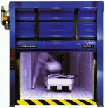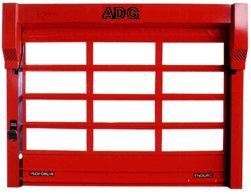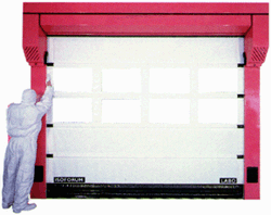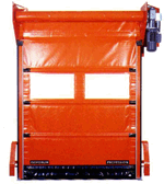 Flexible motorised interior roll-up door with opening speed of 1.2 meters per second. Standard wind resistance of 45 kph. Higher wind resistance on request. Automatically relocates it self if impact should occur. Exterior motor fixed to self-supporting frame. Standard size up to 4.5 x 4.5m. |