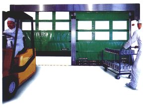 Forum Labo Flexible motorised interior roll-up door with self-supporting frame and opening speed of 1.2 meters per second. Clean Room curtains resist between 4 and 10dN/m2, depending on design. Wholly enclosed rods are sealed to resist bacterial deposits. Impact resistant curtain, with the option of the self-relocating system. Standard size up to 4.5 x 4.5m. |